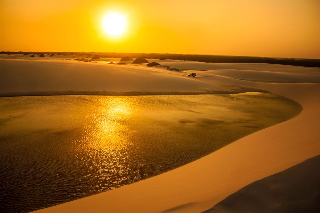 Ao chegar ao parque, o veículo é estacionado, pois não é permitida a entrada de veículos nas dunas. O passeio segue a pé, com caminhada pelas dunas e lagoas.